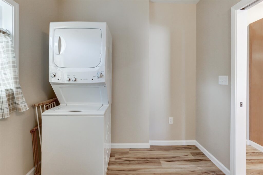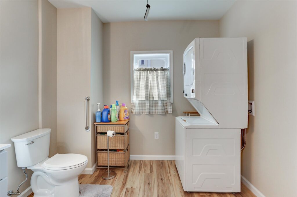 - Combined the bathroom and laundry room into one cohesive, space-saving layout