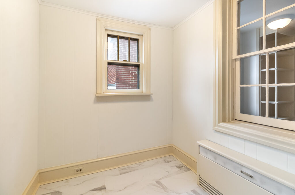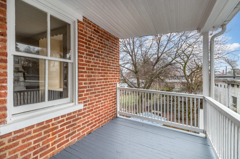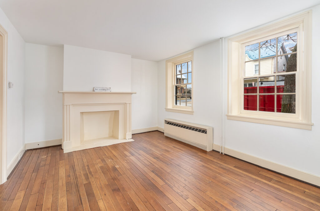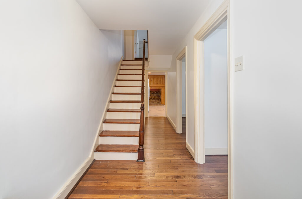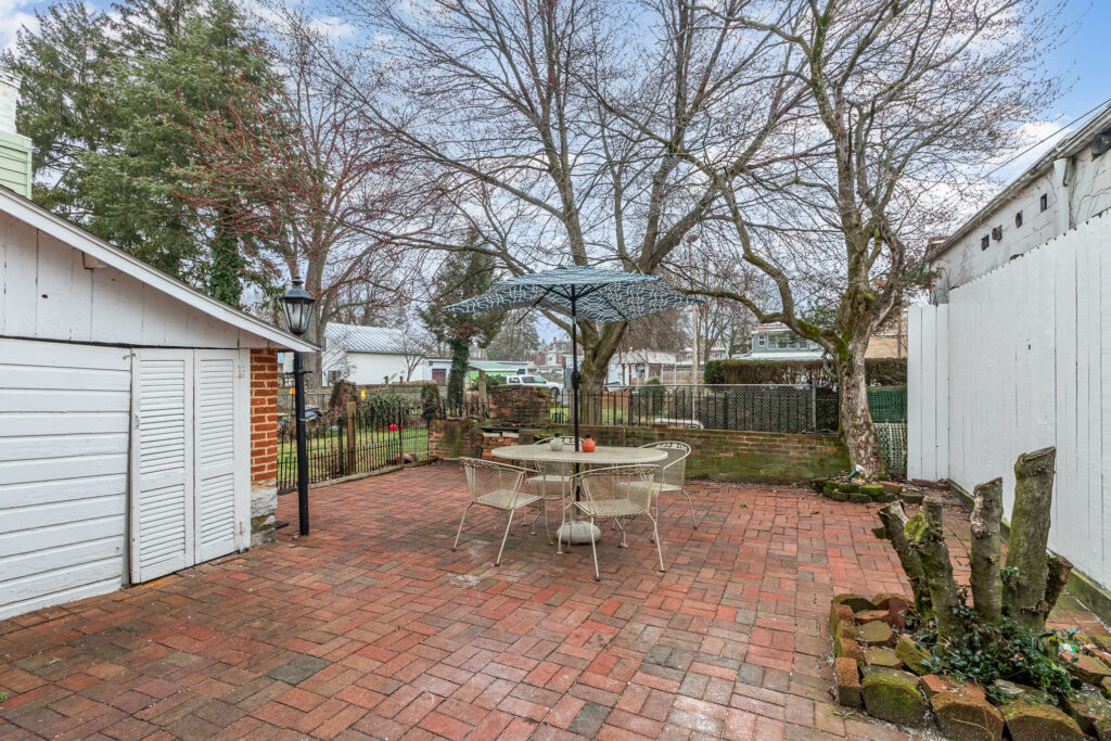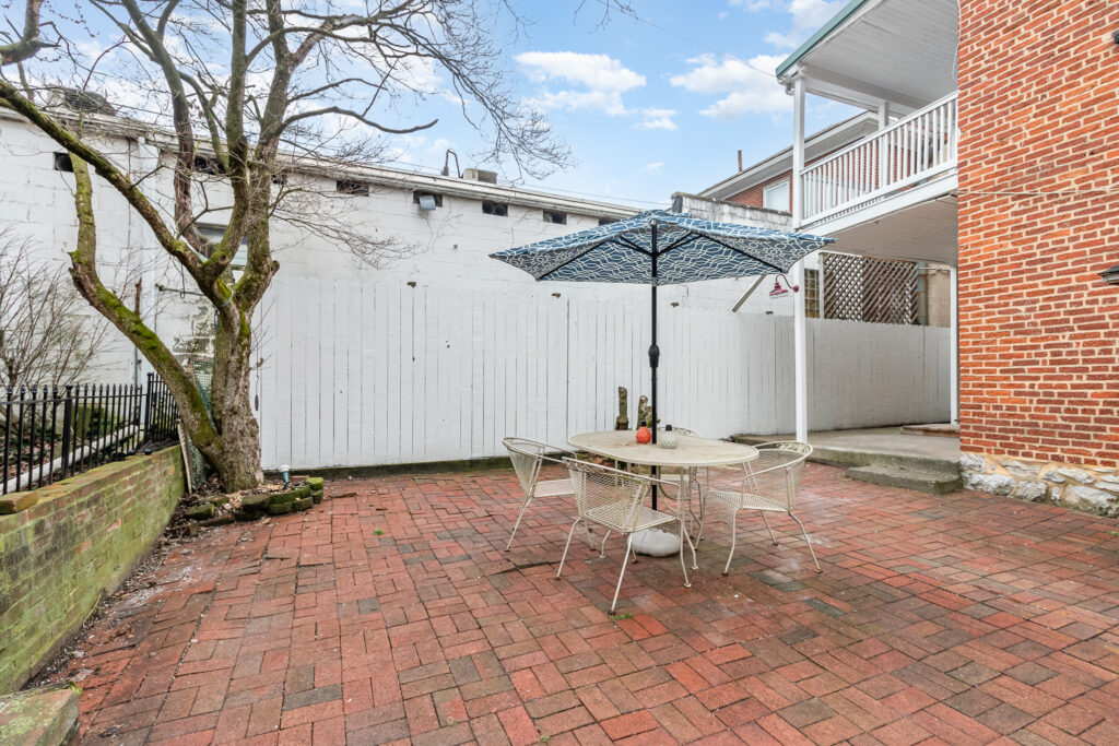 The exterior showcases a rich, historic paint color — Tri Corn Black — which contrasts beautifully with the home’s traditional yellow trim, a color that has graced the property for generations. The original brickwork was carefully preserved and cleaned, while the rear porch was repaired and the brick patio refreshed to maintain its charm and functionality.