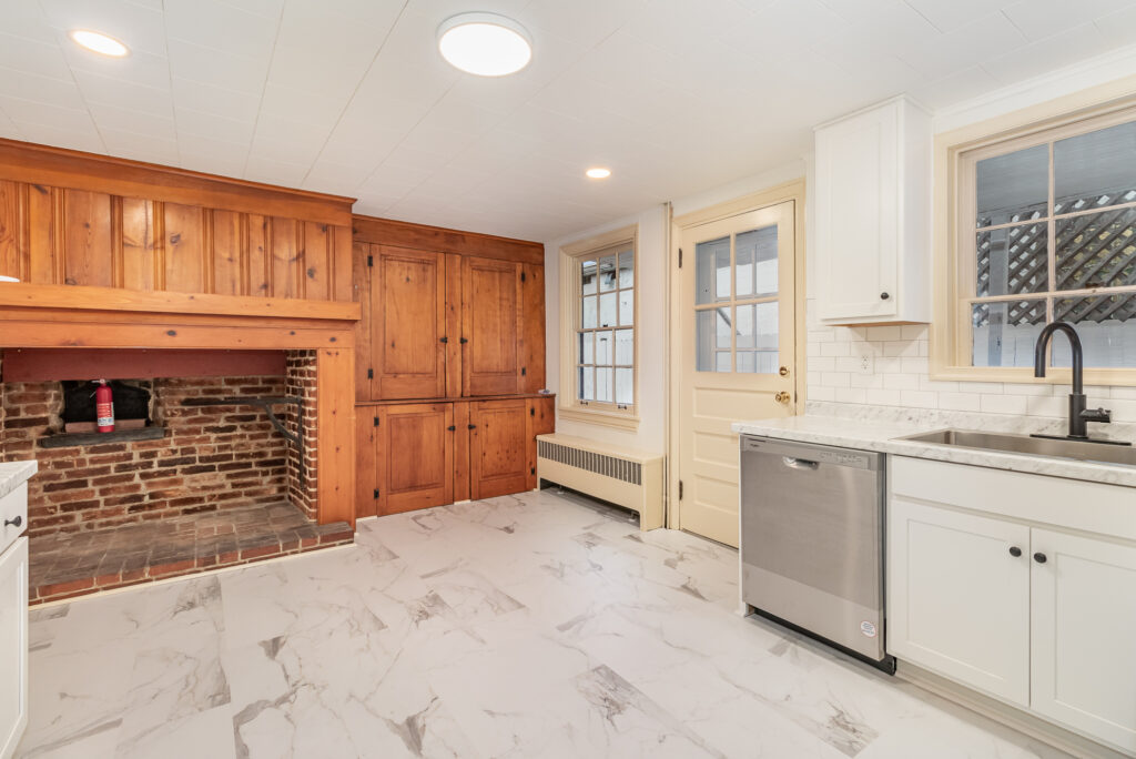 The kitchen balances old and new, incorporating the home’s original summer kitchen fireplace as a centerpiece alongside custom Kraftmaid cabinetry and a Calcutta Marble countertop from Precision Countertop.