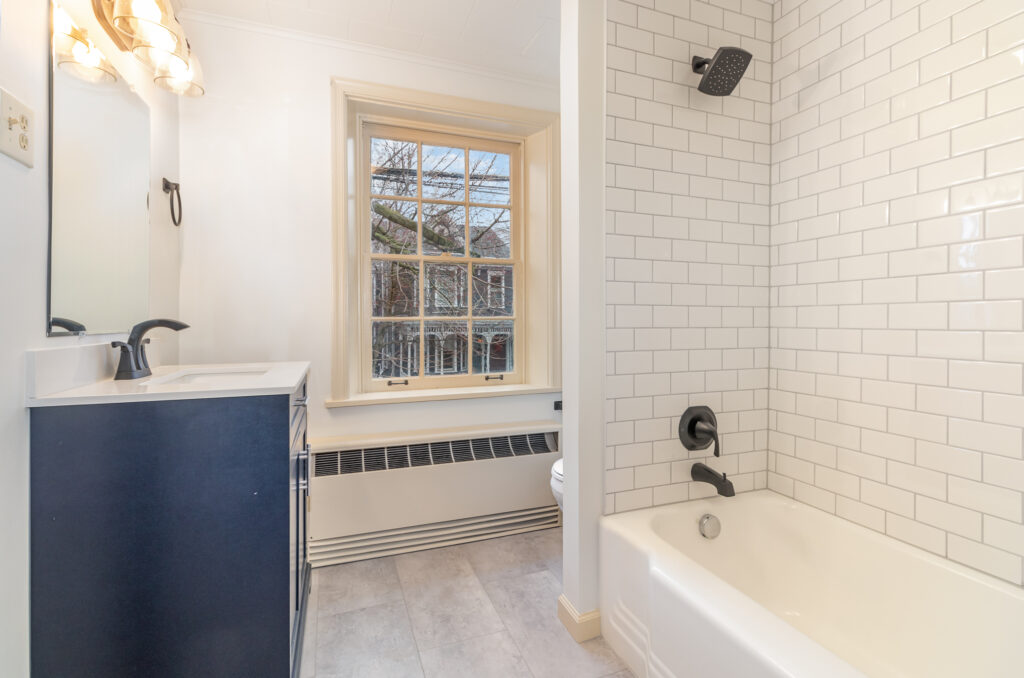 Inside, the historic home renovation extended through the entire house, including a stunning kitchen and bathroom transformation. The bathroom features classic white subway tile, a Midnight Blue Harwell vanity from Style Selections, and Moen Lindor matte black fixtures that blend classic and modern aesthetics.