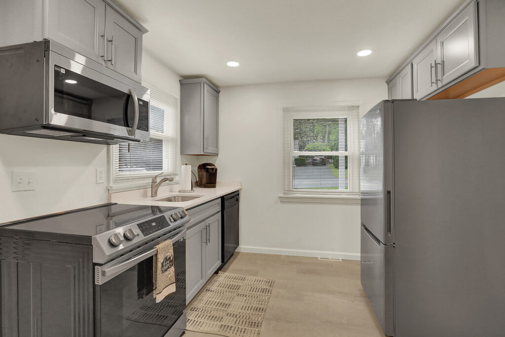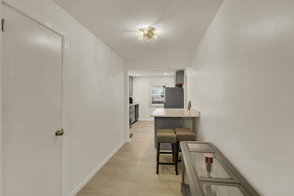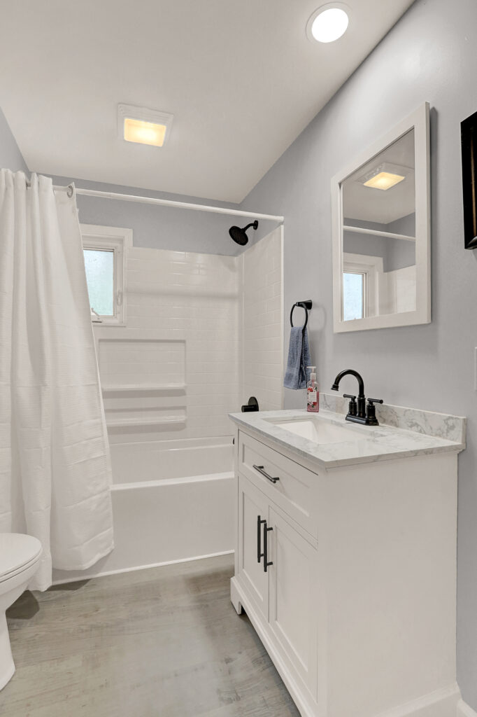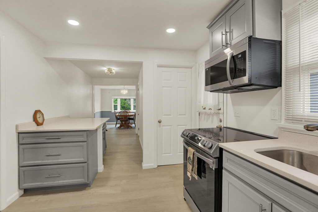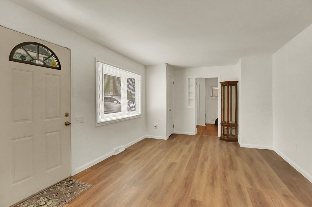The entire interior was updated from floor to ceiling. The home features refinished original hardwoods paired with new luxury vinyl plank and brand-new carpet in the bedrooms for a fresh, cohesive look. We installed custom kitchen cabinetry by Craft-Maid, quartz countertops from Classic Rock, and all-new fixtures in the kitchen and bathroom. Every surface, from trim to walls, received a clean coat of Sherwin-Williams paint, creating a bright finish.
